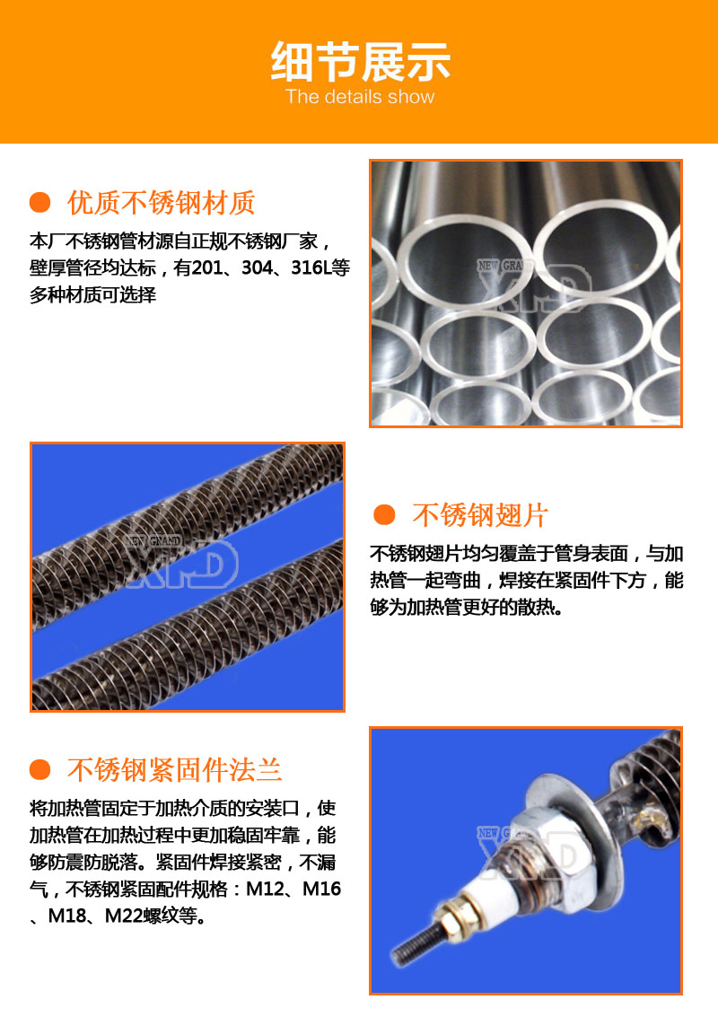 W型翅片空氣電加熱管采用優質不銹鋼、進口氧化鏷粉、高電阻電熱合金絲、不銹鋼散熱片等材料,通過先進的生產設備和工藝制作而成,翅片電加熱管可以安裝在吹風管道中或其它靜止、流動空氣的加熱場合。它與普通加熱管相比,散熱面積擴大了2~3倍,即翅片元件所允許的表面功率負荷是普通元件的3~4倍。由于元件的長度縮短,使得本身的熱損失減小,在相同的功率條件下,具有升溫快、發熱均勻、散熱性能好、熱效率高、使用壽命長、加熱裝置體積小,成本低等優點。根據用戶要求進行了合理的設計,便于安裝。產品在機械制造、汽車、紡織、食品、家電等行業,尤其在空調器風幕行業得到廣泛應用。