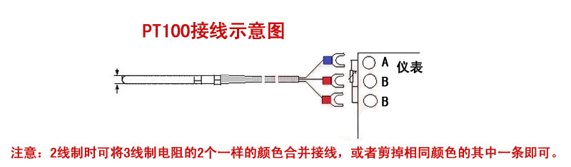 3線制pt100一般是一根紅線二根白線,紅線為A,二根白線都是B,二根B線(白線)都是一樣的,可以按標識的A.B.B接口接上線即可。PT100是一個可變電阻,阻值隨溫度的變化而變化,當溫度在0度的時候,量測AB(紅白)兩根線的阻值是100歐,100度是138.5歐,有兩根白線是因為其中一根白線為補償線,也可以兩條白線裝在一個接口當兩線用,接三線是為了抗干擾,這樣可以減少反饋到控制器的誤差。